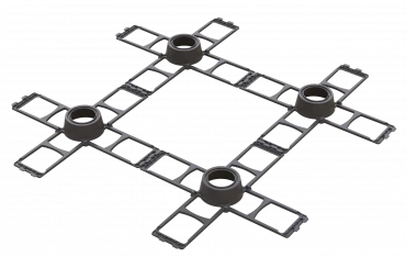 - Die vierarmigen Matrix-Basisgittermodule werden auf der Platte platziert und durch Druckhaken verbunden, wodurch ein Raster für die MEP-Systeme entsteht.